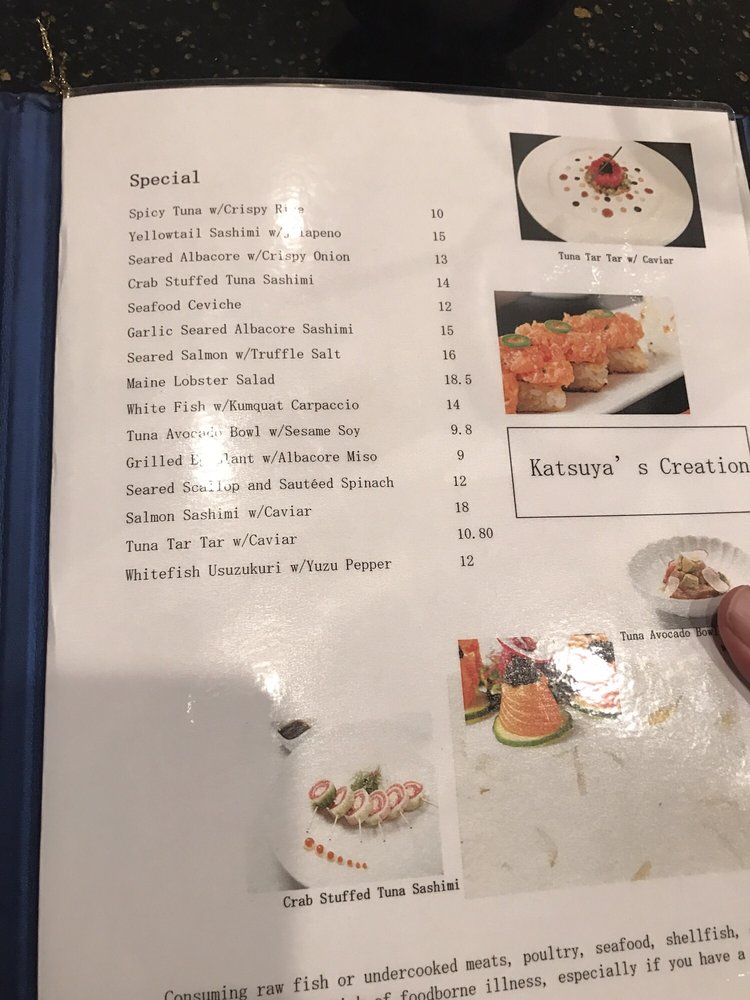 pcs Crispy Rice w/ Spicy Tuna pcs Backed Crab Cut Roll pcs Yellowtail Sashimi w/ Jalapeno pcs Salmon Sashimi w/ Avocado pcs Spicy Albacore w/ Crispy OnionContains sesame seeds. Wasabi, Sushi Ginger(No Substitutions)consuming raw fish or undercooked meats, poultry, seafood, shellfish, or eggs may increase your risk of foodborne illness, especially if you have a medical condition.